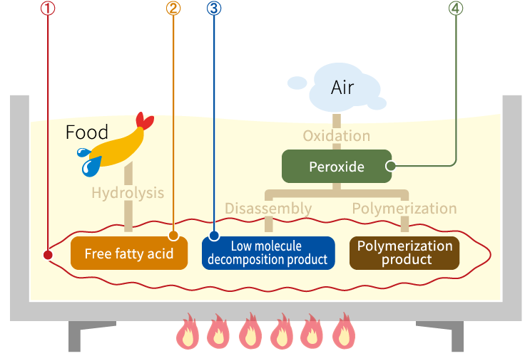 기름이 공기에 노출되면 과산화물이 생성되어 불포화 지방산이 산소를 흡수합니다. 과산화물가는 히드로과산화물을 측정하는 데에도 사용할 수 있지만, 튀김유의 경우 분해 또는 중합을 지표로 사용합니다.