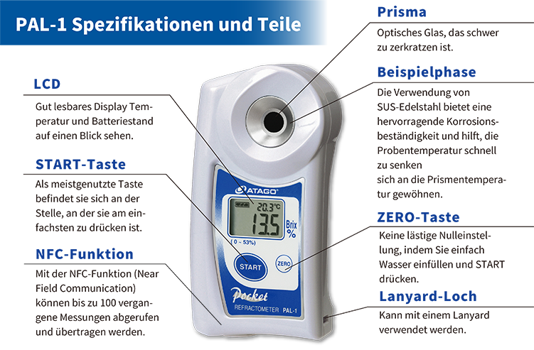 Obendrein hat ATAGO den PAL mit der neuen Technologie ELI (Extrenal Light Interference Prefention) ausgestattet, damit er sicher im Außenbereich eingesetzt werden kann. Herkömmliche digitale Handrefraktometer bergen das Risiko, dass Messungen, die außerhalb oder in der Nähe von Fenstern durchgeführt werden, aufgrund von Lichtinterferenzen ungenau sein können. Während der Entwicklung der PAL-Serie spiegelt die Entwicklung der ELI-Funktion von ATAGO alle Kommentare wider, die von Refraktometerbenutzern auf diesem Gebiet eingegangen sind.