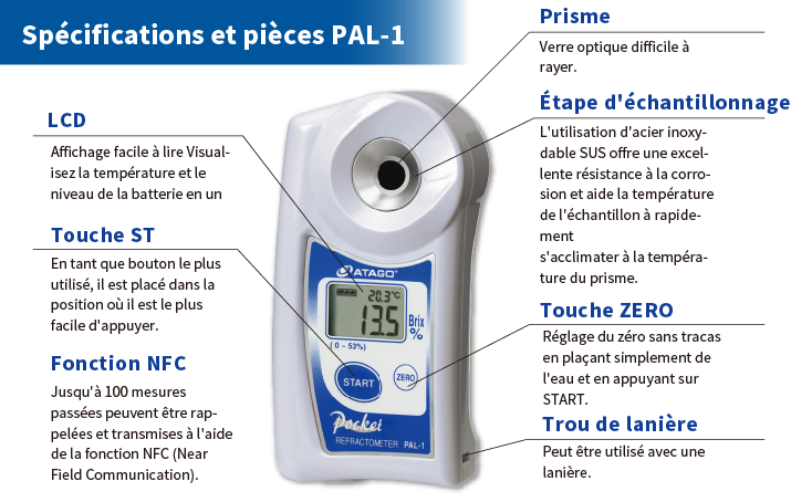 Pour l'ergonomie, ATAGO a poursuivi la conception d'un réfractomètre simple d'utilisation et intuitif. Tout d'abord, il y a eu un succès dans l'évolution de l'optique conventionnelle de forme longue vers un réfactomètre portable avec une forme bien équilibrée. La forme allongée précédente était instable et difficile à placer l'échantillon. Le PAL a été spécialement conçu pour être facile à tenir et a remporté le Good Design Award pour sa "facilité d'utilisation".
